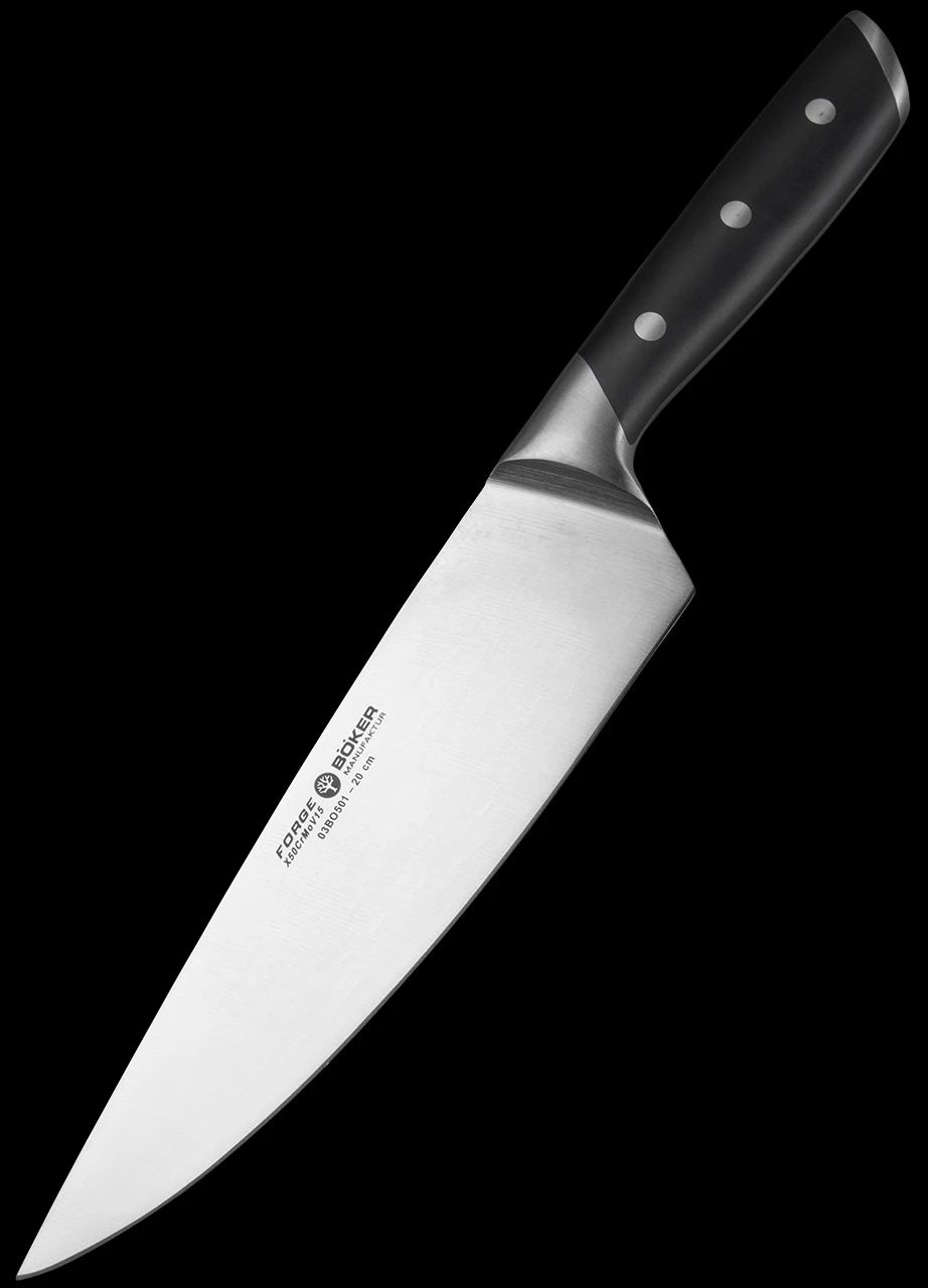 The knives are made from X50CrMoV15 chrome-molybdenum-vanadium stainless steel, are ideally balanced and provide perfect handling due to the ergonomic grip design. Black handle scales made of special high-quality ABS synthetic material are durably combined with three stainless steel rivets and are attached to the completely continuous tang without rivets. The design of the blades, including the transition to the bolster, allows easy sharpening and ensures long-term perfect function for the knives in combination with proper care. Please only hand wash the knives, do not place in dishwasher. Moreover, the Boker Forge series convinces with an incredibly attractive price-performance ratio.Â