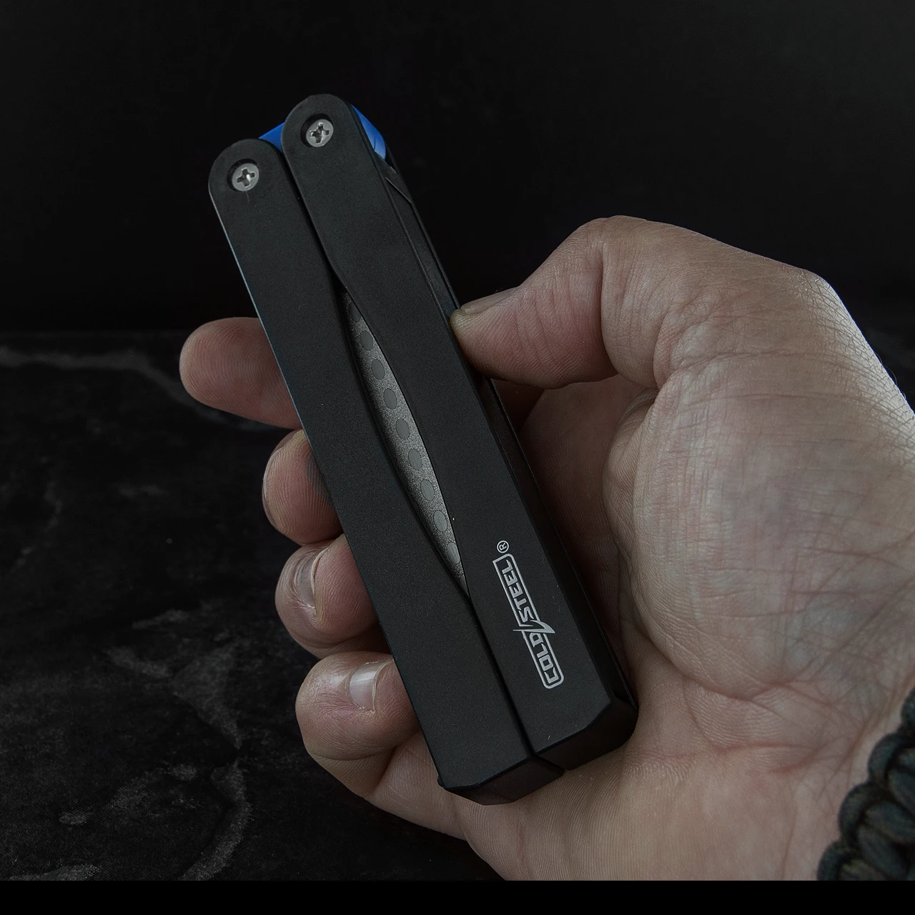 The Cold Steel Folding Sharpener has two diamond coated knife sharpeners. One side has a 360 grit surface for edge setting and the other has an extra fine 600 grit surface for razor sharp honing. The honeycombed surface allows you to sharpen knives quickly, because the filings are accumulated away from the grit. You can sharpen dry or with water if you choose.
