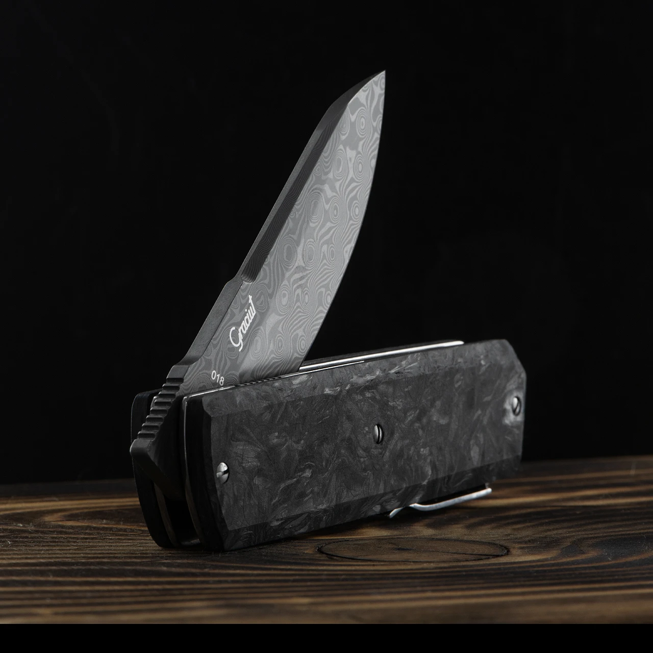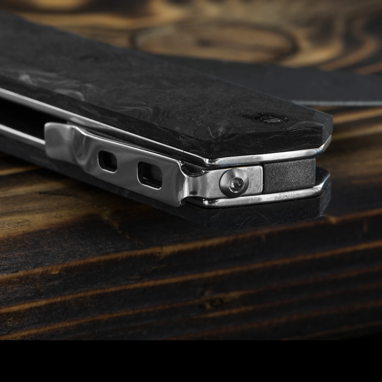 The thick set handle really fills the hand and is made from black Fat Carbon. It creates a stunning visual spectacle that will really draw the eye and be the focus of any collection or pocket.