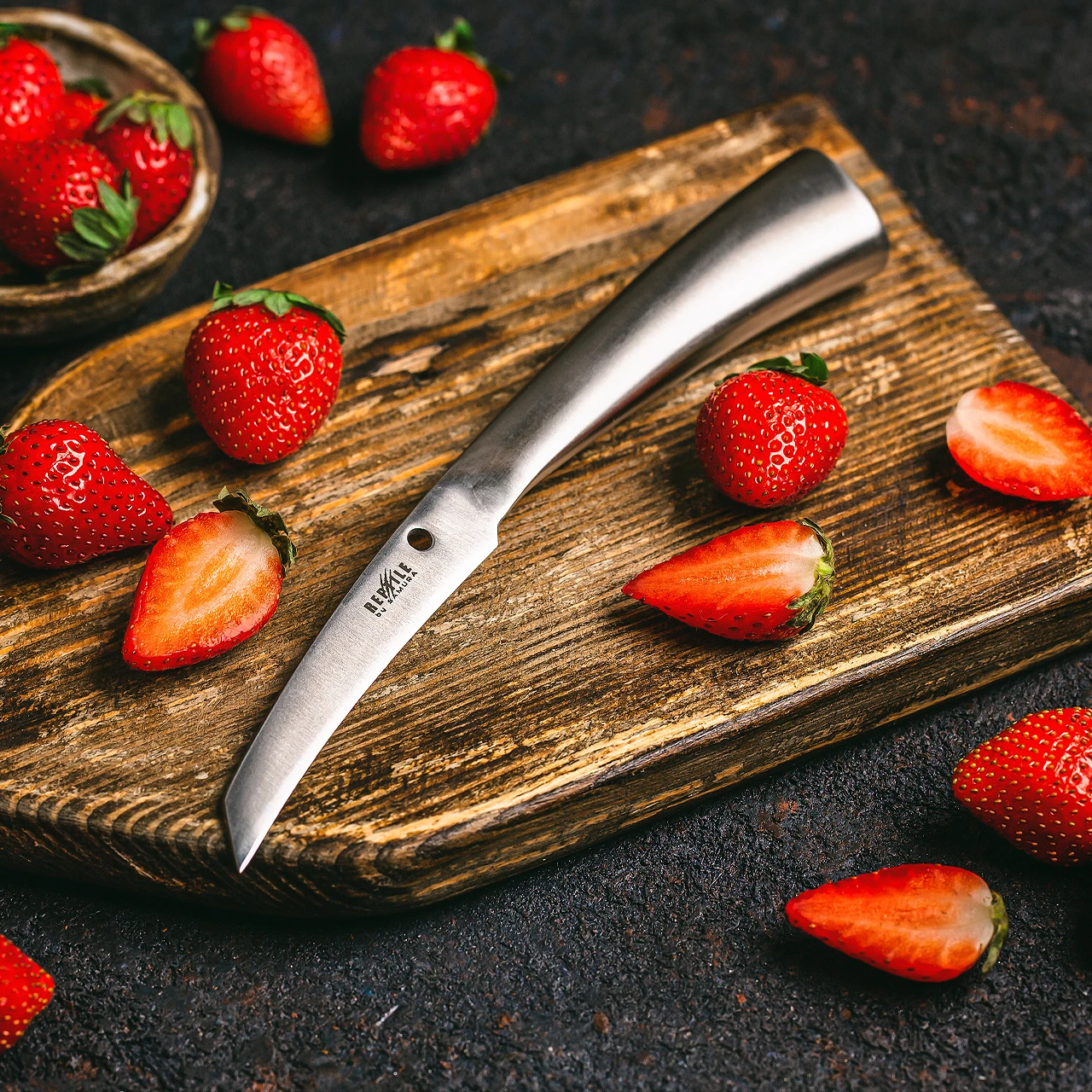 It is designed for peeling and slicing small vegetables and fruits, and its short narrow blade is able to cope splendidly well with this task. With a very light (only 50 grams), compact and ergonomic non-slip oval handle, the vegetable knife is maximally adapted even for quite a lengthy manipulation.